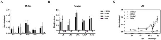 Antibody responses to peptides (aa 32–aa 61) designed from the GP5 ectodomain of different lineages. Relative levels of antibody response to the GP5 ectodomain are shown using serum samples collected at (A) 64 dpv and (B) 14 days post-challenge (dpc) from vaccinated and challenged (L1D MLV and L5 MLV), unvaccinated and challenged (control), or unvaccinated (naïve) groups. Peptides corresponding to L5 (D11-052871), L1C (46/2020), L1A (IA/2014), L1C* (KP283416) and L1D (KY348849) were used to assess vaccination response. Two-way ANOVA. (C) Kinetics of antibody response to the GP5 ectodomain peptide derived from 46/2020 (lineage 1C.5). The arrow indicates challenge with an L1A isolate (IA/2014) at 64 dpv. Data are shown as means ± SEMs. Values are normalized as relative levels compared to a reference serum.