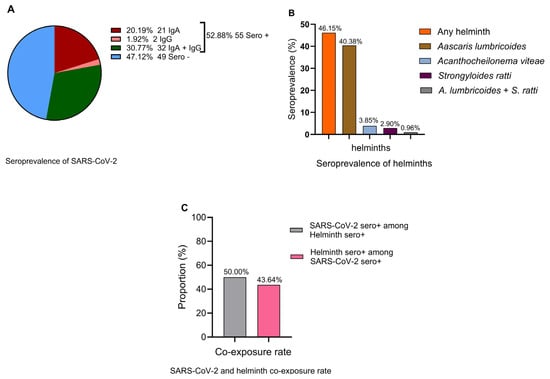 Seroprevalence of SARS-COV-2 (A) IgA (red), IgG (coral), IgA and IgG (green), and seronegative (blue), (B) any (pooled) helminth (orange), Ascaris lumbricoides (bronze), Acanthocheilonema viteae (homologous with human filaria species) (light blue), Strongyloides ratti (maroon), A. lumbricoides + S. ratti (gray), (C) SARS-CoV-2 seropositivity among helminth-seropositive individuals (gray) and helminth seropositivity among SARS-CoV-2-seropositive individuals (pink).