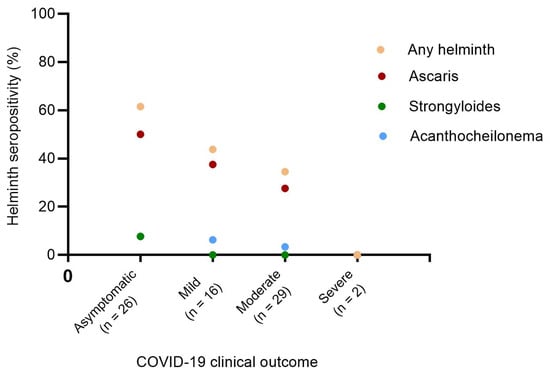 Prevalence of helminth seropositivity among COVID-19 patients with asymptomatic, mild, moderate, and severe clinical presentation. Chi-squared test p-values for trend p = 0.0197, p = 0.0465, p = 0.0890, and p = 0.4413 for any helminth (orange dots), Ascaris lumbricoides (red dots), Acanthocheilonema viteae (blue dots), and Strongyloides ratti (green dots) respectively. Any helminth refers to the pooled helminths (Ascaris lumbricoides, Strongyloides ratti, and Acanthocheilonema viteae).