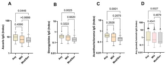 Next, we compared the relative expression levels of helminth-specific IgG in asymptomatic, mild, and moderate/severe cases. The data show that helminth-specific IgG indices were significantly higher in asymptomatic SARS-CoV-2-infected individuals (Asy) than in moderate and severe COVID-19 patients (Mod/Sev). The results for all the helminths tested followed this trend, peaking in asymptomatic individuals and diminishing with increasing disease severity. Asymptomatic individuals exhibited 1.5 times the levels of helminth-specific IgG compared to those with moderate/severe symptoms (Figure 3).