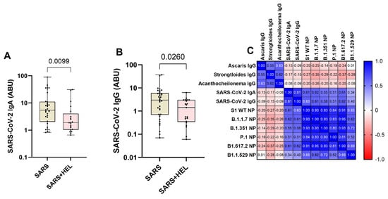 Furthermore, we aimed to identify the influence of helminth exposure on the development of humoral immunity against SARS-CoV-2. The results indicated that individuals exposed to helminths showed a significantly reduced expression of SARS-CoV-2-specific IgA/IgG (p = 0.0099, p = 0.0260) (Figure 4A,B) and neutralization potency against the wild type and variants (Figure 5). Similarly, helminth-specific IgG was negatively correlated with SARS-COV-2 neutralizing antibody expression (Figure 4C).