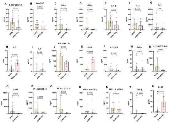 Lower expression of pro-inflammatory markers and higher expression of anti-inflammatory markers in co-exposed individuals. The graph represents the relative expression of G-CSF(A), GM-CSF (B), INF-α (C), IFN-γ (D), IL-1 β (E), IL-2 (F), IL-4 (G), IL-5 (H), IL-6 (I), IL-8 (J), IL-10 (K), IL-12p70 (L), TNF-α (M), IL-17A (N), IL-18 (O), IP-10 (P), MCP-1 (Q), MIP-1α (R), MIP-1β (S), TNF-β (T), IL-13 (U) in mono-exposed (wheat bars) and co-exposed individuals (pink bars). Bars indicate the median cytokine expression and interquartile range, while dots represent individual participants.
