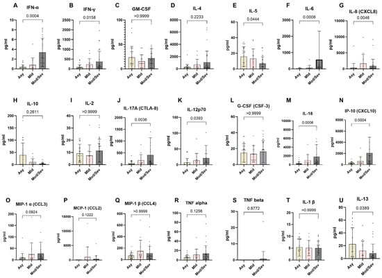 Lower expression of pro-inflammatory markers in asymptomatic individuals. The graph represents the relative expression of INF-α (A), IFN-γ(B), GM-CSF(C), IL-4 (D), IL-5 (E), IL-6 (F), IL-8 (G), IL-10 (H), IL-2 (I), IL-17A (J), IL-12p70 (K), G-CSF (L), IL-18 (M), IP-10 (N), MIP-1α (O), MCP-1 (P), MIP-1β (Q), TNF-α (R), TNF-β (S), IL-1β (T), and IL-13 (U) in individuals who were either asymptomatic (wheat bars), mild (pink bars), or moderate/severe (gray bars) to SARS-CoV-2 infection. The Kruskal–Wallis statistical test was utilized. Bars indicate the median cytokine expression and interquartile range, while the dots represent individual participants.