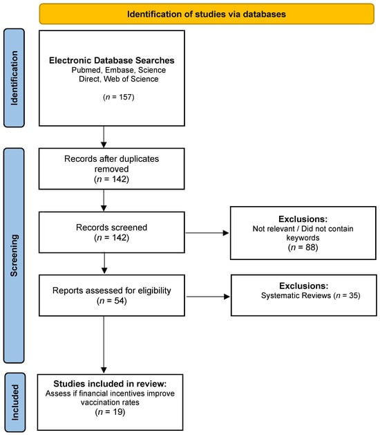 The appraisal process involved various tools tailored to the specific type of study conducted. For randomized controlled trials, we utilized the Revised Cochrane Risk-of-Bias Tool for Randomized Trials (RoB 2). In contrast, we applied the Appraisal Tool for Cross-Sectional Studies (AXIS Tool) for cross-sectional and survey studies. Lastly, we utilized the Newcastle–Ottawa Scale (NOS) to appraise the case study. Our goal was to ensure the integrity and reliability of our findings as we examined the effectiveness of incentives in addressing vaccine hesitancy. In analyzing these selected studies, we aimed to provide meaningful insights that can enhance public health strategies and vaccination efforts. Refer to Figure 1 for the PRISMA flow diagram summarizing the literature search screening process. In this chart, the total number of studies found through all the different databases were combined, and this illustrates why some studies were excluded from the research. Most of the studies were excluded due to their not being relevant to the specific study topic and/or being a systematic review rather than an individual study. This led to a final count of 19 studies to be reviewed and included in this research paper.