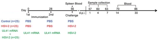 Seventy-five female mice were purchased from Sibeifu Biotechnology Co., Ltd., Zhengzhou, China. These mice were aged 4 weeks. The mice were classified into three groups: the control group, the HSV-2 group, and the UL41 mRNA + HSV-2 group. Each group contained 25 mice. The mice in the UL41 mRNA + HSV-2 group were immunized twice with 10 μg of the HSV-2 UL41 mRNA vaccine at day 0 and 28 in the gastrocnemius muscle, and the mice in the HSV-2 group and control group were immunized twice with equal volumes of PBS at the indicated timepoints (0 and 28 days). Serum and splenic cells were obtained 28 days after the last immunization. The mice in the HSV-2 group and the UL41 mRNA + HSV-2 group were then challenged with 5 × 105 PFU of the HSV-2 HG52 strain intravaginally, and the mice in the control group were challenged with an equal volume of PBS intravaginally (Figure 1).