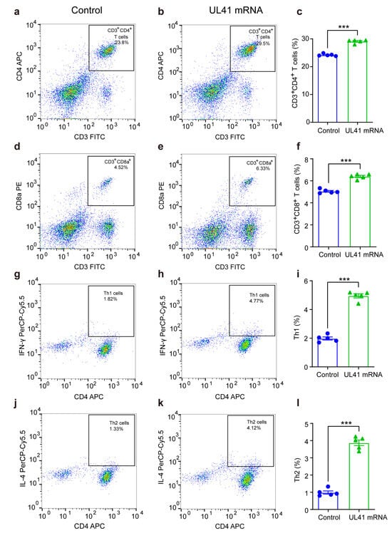 The immunogenicity of an mRNA vaccine is the key to whether it can effectively activate the immune system. To evaluate the immunogenicity of the HSV-2 UL41 mRNA vaccine, we collected single cells from the spleen tissues in control and UL41 mRNA vaccine-immunized mice on day 56, four weeks after the second immunization, and observed the activation of T cells in the spleens of the mice. A gating strategy was adopted to analyze T cells as shown in Figure S2. Compared with mice in the control group, the percentages of CD4+ and CD8+ T cells (Figure 3a–f), as well as IFN-γ-secreting predominantly Th1 cells and IL-4-secreting Th2 cells, were significantly increased in the UL41 mRNA vaccine-immunized group (p < 0.001) (Figure 3g–l). The results indicated that the mRNA vaccine significantly increased the number of CD8+ T cells, CD4+ Th1 cells, and Th2 cells, suggesting that cellular immunity was activated in mice after immunization.