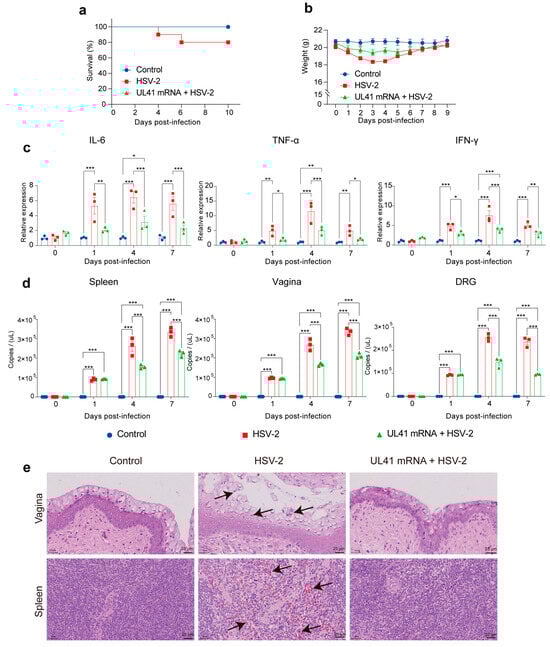 Comparison of the protective effects, inflammatory responses, and histology of mice in the control, HSV-2, and UL41 mRNA + HSV-2 groups after HSV-2 infection. (a) Survival curve. p values were calculated via the log-rank test (n = 10). (b) Weights of the mice in the control, HSV-2, and UL41 mRNA + HSV-2 groups (n = 10). (c) IL-6 (left panel), TNF-α (middle panel), and IFN-γ (right panel) levels in the vagina (n = 3). (d) HSV-2 viral loads in the spleen (left panel), vagina (middle panel), and DRG (right panel) (n = 3). The experiments were performed once with three mice in the PBS group, three mice in the HSV-2 group, and three mice in the HSV-2 UL41 mRNA group at days 1, 4, and 7 after the challenge. Statistical differences were determined by one-way analysis of variance (ANOVA) with Tukey’s multiple comparisons test. * p < 0.05, ** p < 0.01, *** p < 0.001. The error bars represent the SEMs (c,d). (e) UL41 mRNA improved the histopathological images by HE staining among the UL41 mRNA + HSV-2, HSV-2, and control groups. Vaginal tissues (upper panels) and spleen tissues (lower panels). The black arrows indicate the inflammtory inflitration.