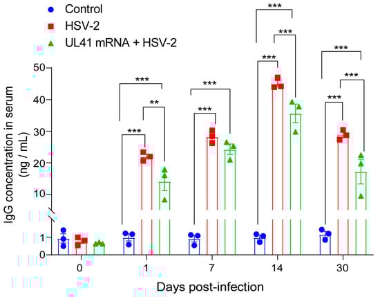 The IgG levels in the serum of mice in the control, HSV-2, and UL41 mRNA + HSV-2 group after HSV-2 infection. The serum IgG levels of the mice were measured via enzyme-linked immunosorbent assay (ELISA) (n = 3 ). The experiments were performed once at 0, 1, 7, 14, and 30 days after the challenge. Statistical differences were determined by one-way analysis of variance (ANOVA) with Tukey’s multiple comparisons test. ** p < 0.01, *** p < 0.001. The error bars represent the SEM.