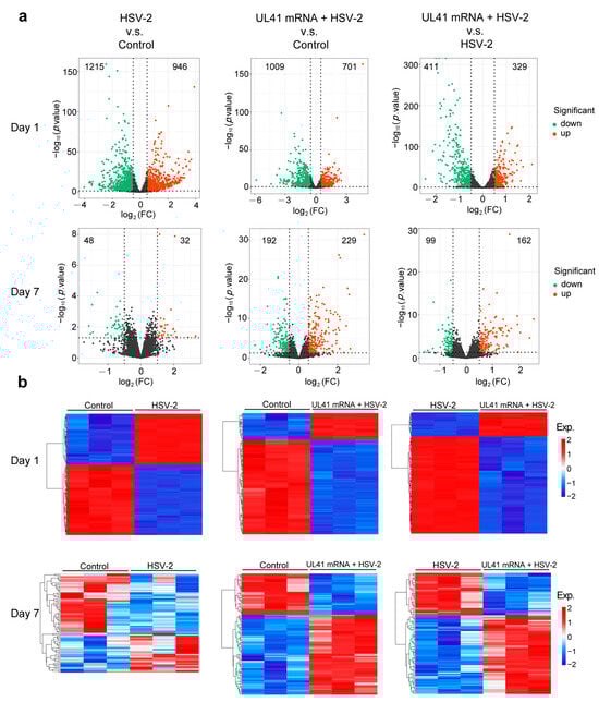 The significantly differentially expressed genes of HSV-2 vs. control, UL41 mRNA + HSV-2 vs. control, and UL41 mRNA +HSV-2 vs. HSV-2. (a) Volcano maps of different genes at 1 and 7 d.p.i. according to pairwise comparisons among the control, HSV-2, and UL41 mRNA + HSV-2 groups. (b) Heatmaps of DEGs at 1 and 7 d.p.i. according to pairwise comparisons among the control, HSV-2, and UL41 mRNA + HSV-2 groups. Red represents upregulated proteins, and green or blue represents downregulated genes.
