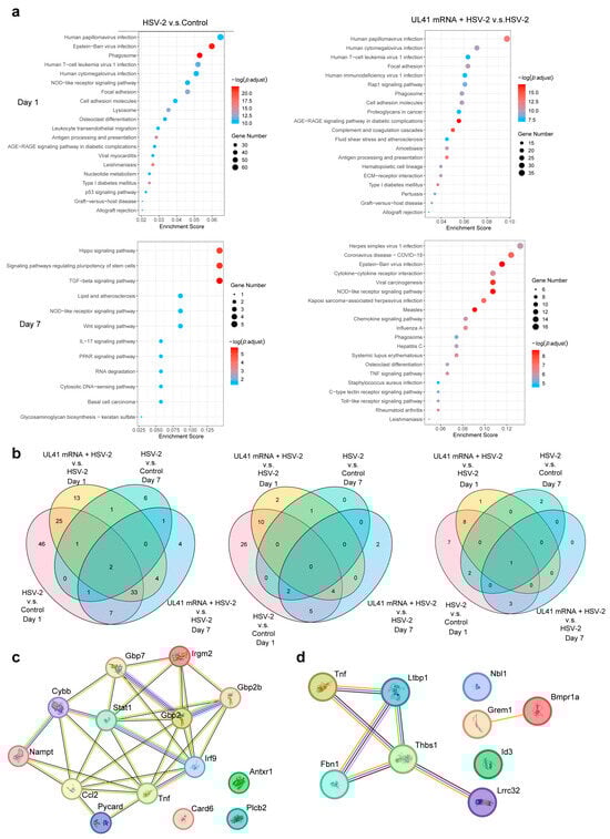 On the seventh day after immunization, a total of 71 signaling pathways, including the TGF-β signaling pathway, the signaling pathway that regulates stem cell pluripotency, the Wnt signaling pathway, the PPAR signaling pathway, the Nod-like receptor signaling pathway, the IL-17 signaling pathway, etc., were enriched in the DEGs from the HSV-2 group vs. the control group. A total of 200 signaling pathways from the UL41 mRNA + HSV-2 group vs. the HSV-2 group were significantly enriched, and 52 pathways (p < 0.05), including cytokine–cytokine receptor interaction, Th17 cell differentiation, the TNF signaling pathway, the Toll-like receptor signaling pathway, the JAK-STAT signaling pathway, the IL-17 signaling pathway, and the interaction of viral proteins with cytokines and cytokine receptors, were enriched.