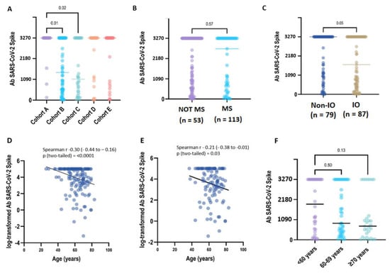 In the overall population, a medium but highly significant correlation (r = −0.31, p < 0.0001) was found between age and the log-transformed values of antibody titres. In the univariate regression analysis, an older age was correlated with a lower Ab titre (beta = −0.038, p = 0.0009), but only a small part of heterogeneity was explained by the model (r2 = 0.07). A weaker, but still significant, correlation (r = −0.21, p < 0.03) was found between age and the log-transformed values of the antibody titres in the uninfected patients. In the univariate regression analysis, the relationship between age and Ab titres was borderline significant (beta = −0.03, p = 0.06), explaining only a very small part of h heterogeneity (r2 = 0.03). In the COVID-19-naive patients, when age was categorised in three groups (<60 years, 60–69 years and ≥70 years), no statistical difference was observed (p = 0.018) but the evidence for a decreasing trend in Ab titres related to an increase in age was borderline significant (p = 0.07) (Figure 1D–F) (Table S5).