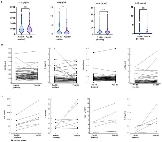 Cytokine dynamics after booster dose administration. (A) Comparison between the median pre-BD value of four analysed cytokines (IL2-R, IL-6, TNFα, IL-10) and the post-BD measurement. (B) Longitudinal plots of the cytokine concentration (pg/mL) before and after BD; lines connect paired samples, there were no statistically significant differences found by the Wilcoxon matched pairs signed rank test. (C) Longitudinal plots of seven patients reporting a ≥1.5-fold increase in at least two cytokines; orange dots point out ≥1.5-fold increased post-BD values.