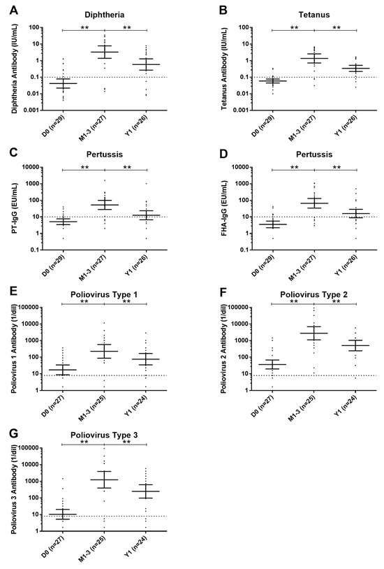 Changes in antibody levels for various pathogens. This figure illustrated the geometric mean concentrations/titers and 95% confidence intervals for specific antibodies: diphtheria (panel (A)), tetanus (panel (B)), pertussis toxin (PT) of Bordetella pertussis (panel (C)), filamentous hemagglutinin (FHA) of B. pertussis (panel (D)), poliovirus type 1 (panel (E)), poliovirus type 2 (panel (F)), and poliovirus type 3 (panel (G)). Measurements were taken before vaccination (D0), 1–3 months post-third vaccination (M1–3), and 1-year post-third vaccination (Y1). The horizontal dashed lines indicated the seroprotective antibody levels. Antibody concentrations/titers at each time points were compared using the Wilcoxon matched-pairs signed rank test. The level of statistical significance (p < 0.001) was indicated by the use of two asterisks (**). Abbreviations: D0, before vaccination; M1–3, 1–3 months after completion of vaccination; Y1, 1 year after completion of vaccination; PT, pertussis toxin; FHA, filamentous haemagglutinin.