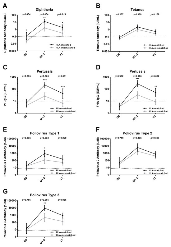 Changes in antibody levels for various pathogens stratified by HLA matching level (matched vs. mismatched). This figure illustrated the geometric mean concentrations/titers and 95% confidence intervals for specific antibodies: diphtheria (panel (A)), tetanus (panel (B)), pertussis toxin (PT) of Bordetella pertussis (panel (C)), filamentous hemagglutinin (FHA) of B. pertussis (panel (D)), poliovirus type 1 (panel (E)), poliovirus type 2 (panel (F)), and poliovirus type 3 (panel (G)). Measurements were taken before vaccination (D0), 1–3 months post-third vaccination (M1–3), and 1-year post-third vaccination (Y1). The data were stratified by human leukocyte antigen matching levels. The horizontal dashed lines indicated the seroprotective antibody levels. Antibody concentrations/titers at each time points were compared between matched and mismatched cases using the Mann–Whitney U test. The levels of statistical significance were indicated by asterisks as follows: p < 0.05 was denoted by one asterisk (*), p < 0.01 by two asterisks (**), and p < 0.001 by three asterisks (***). Abbreviations: D0, before vaccination; M1–3, 1–3 months after completion of vaccination; Y1, 1 year after completion of vaccination; HLA, human leukocyte antigen; PT, pertussis toxin; FHA, filamentous haemagglutinin.