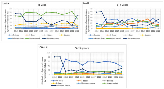 Distribution of pertussis cases per year (2010–2022) in European pediatric population according to vaccination status per age group (<1 year: (Panel A), 1–4 years: (Panel B), >4–14 years: (Panel C)) according to European Centre for Disease Prevention and Control (ECDC) (https://atlas.ecdc.europa.eu/public/index.aspx (accessed on 20 December 2024)).
