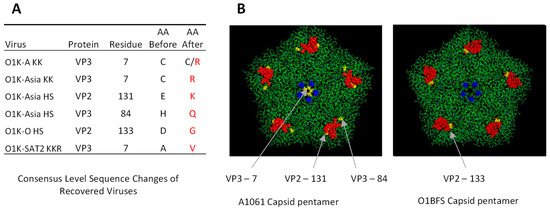 As mentioned above, full-genome sequencing indicated that all of the introduced aa changes were faithfully retained in the rescued viruses. However, for some of the rescued viruses, additional changes were observed. These mapped to the outer capsid surfaces and were located very close to the site of the introduced changes (see Figure 1). Given that the additional changes are close to the site of the introduced changes, they could directly contribute to forming a receptor-binding site that allows the infection of BHK-21 cells. With this in mind, for the O1K-Asia HS virus, the additional changes were within or close to the canonical HS binding site (VP3 H84Q and VP2 E131K), and the changes (VP3 C7R) in O1K-A KK and O1K-Asia KK viruses would further increase the number of positively charged aa at the icosahedral 5-fold symmetry axes, which could strengthen interactions with negatively charged receptors, such as heparan sulphate (or other glycosaminoglycans). Alternatively, the additional changes could indirectly influence receptor interactions or serve as capsid-stability-restoring compensatory aa substitutions [54] to offset possible reduced capsid stability that results from the introduced changes.