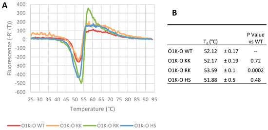 Thermal stability of the recovered type O viruses. The thermal stability of the recovered type O viruses was determined using the pASTRY assay. Gradient purified virus (1 μg) was mixed with Sybr Green II RNA binding dye, and fluorescence was read at 0.5 °C intervals for 20 s at each temperature. The experiment was repeated three times with triplicate samples. Panel (A) shows representative traces of the inverse first differential of fluorescence against temperature for each virus. Panel (B) shows the mean ± SD of the TR value for each virus. The TR value is the temperature of the RNA genome’s exposure to dye as calculated from the temperature at which the inverse first differential fluorescence curve is at its minimum, and a higher TR indicates increased particle stability. The p-values for each of the modified viruses (paired with O1K-O WT) were calculated by unpaired t-test (two tailed).