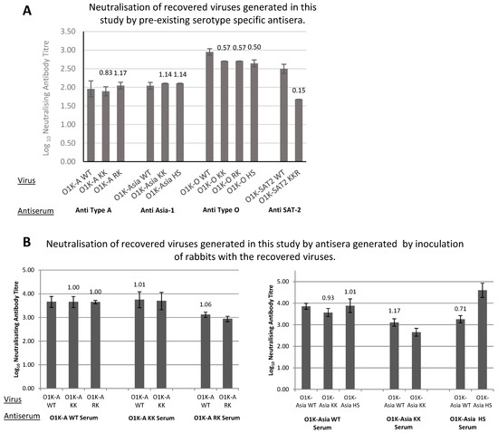 It is also possible that aa changes introduced into the capsid could affect the antigenicity of the viruses. Therefore, we compared the antigenic properties of viruses with wt or modified capsids using virus neutralisation tests (VNTs). Initially, we used existing cattle sera generated against viruses (or vaccines) that are closely related to the field strains from which the capsids used to construct the chimeric viruses were derived. These VNTs were carried out using BTY cells, as some of the viruses (particularly O1K-O WT and O1K- SAT2 WT) grow very poorly on the cell lines typically used for such assays (BHK-21 or IBRS-2). Briefly, the viruses were mixed with doubling dilutions of neutralising antiserum, inoculated onto BTY cells, and the antibody neutralisation titre was measured, expressed as the dilution of antibodies that gave 50% protection against CPE. Figure 3A shows the antibody neutralisation titres (expressed as log10 of the dilution of antibodies that gave 50% protection of BTY cells against CPE) and that all of the O, A, and Asia-1 viruses with modified capsids had similar antibody neutralisation titres to the corresponding viruses with a wt capsid. The antigenic match between two viruses can be expressed as a ratio, referred to as R1 (here, R1 is the antibody neutralisation titre for a modified virus divided by that for the virus with the wt capsid). For vaccine matching purposes, an R1 cut-off value of 0.3 or above is used to indicate a good vaccine match according to the OIE manual [43]. For the type A, Asia-1, and O viruses with modified capsids, the R1 values were all above 0.3, suggesting that the introduced aa changes are unlikely to affect the principal antigenic neutralisation sites on the capsid. In contrast, the neutralisation titre for O1K-SAT2 KKR was notably lower (R1 = 0.15) than that for O1K-SAT2 WT. However, it remains to be determined if this would be a problem for vaccine efficacy in vivo (see Section 4).
