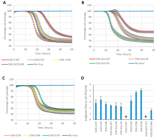 Rate of CPE in adherent BHK cells. Confluent monolayers of adherent BHK cells in a 96-well plate were infected with the indicated virus (Panels (A–C): MOI of 0.01) and the progression of CPE (as measured by the reduction in percentage cell coverage) monitored over time. Data are shown as the mean ± SD for five replicate wells from one experiment representative of two that gave similar results. (D) Triplicate BHK monolayers in 96-well plates were infected (MOI of 0.01) with the indicated virus. When cell coverage dropped below 80% (as determined in panels A–C), the infections were stopped by freezing the cells. Virus titres were quantified by plaque assay on BHK cells, and the mean ± SD of triplicate samples are shown. Note: For the O1K-O WT and O1K-SAT2 WT viruses, an MOI of 0.01 could not be achieved, and thus they are not included in (A–C), and are marked with a “+” symbol in (D).