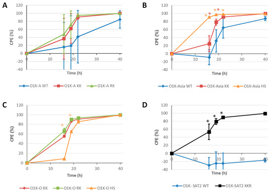 Rate of CPE in suspension BHK cells. Suspension BHK cells in 400 mL minibioreactors were infected with the indicated viruses at an MOI of 0.001. Cells were collected at 16 h, 19 h, 22 h, and 40 h post infection and the cell viability rate was determined by counting viable cells. Each data point represents the mean ± SD from triplicate experiments. Note: For the O1K-O WT virus, an MOI of 0.001 could not be achieved, and thus it was not included in the experiment. Asterisks indicate that the CPE value at that timepoint is significantly different (as determined by t-test) for the virus indicated by the asterisk colour from the value for the virus carrying WT capsid (panels (A,B,D)) or the value for the O1K-KK virus (Panel (C)).