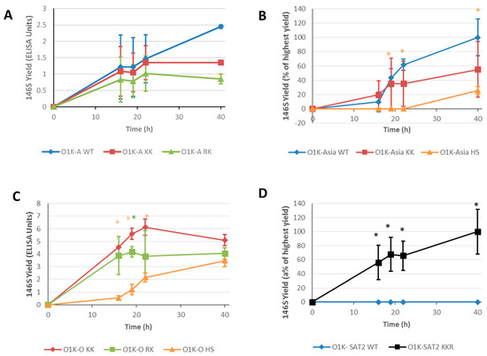 146S particle yields generated in suspension BHK cells. Suspension BHK cells in 400 mL minibioreactors were infected with the indicated viruses at an MOI of 0.001. Samples were collected at 16 h, 19 h, 22 h, and 40 h post infection. Yields of 146S particles were calculated by ELISA using the camelid VHH M3 (Panel (A,C)) or sucrose density gradient ultracentrifugation followed by UV analysis (Panels (B,D)). Data are shown as the mean ± SD from triplicate experiments. Note: For the O1K-O WT virus, an MOI of 0.001 could not be achieved, and thus it was not included in the experiment. Asterisks * indicate that the 146S yield at that timepoint is significantly different (as determined by t-test) for the virus indicated by the asterisk colour, from the 146S yield for the virus carrying WT capsid (panels (A,B,D)) or the value for the O1K-KK virus (Panel (C)).