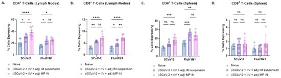 Flow cytometry analysis was used to evaluate CD4+ and CD8+ T-cells in the lymphocytes and splenocytes of vaccinated mice. Antigen-specific responses were assessed by stimulating the cells with the respective antigen and IL-2 to activate antigen-primed T-cells in vaccinated mice. The IN-MP vaccine led to significant antigen-specific CD4+ T-cell responses in the lymphocytes and splenocytes of vaccinated mice compared to the control group with no treatment. The percentage of SCoV-2-specific CD4+ T-cells in the lymphocytes was higher than the percentage of influenza-specific CD4+ T-cells. The IN-MP vaccine induced CD4+ T-cell responses that were comparable or higher than those of the IM suspension vaccine (Figure 6A,C). Significant antigen-specific CD8+ T-cell responses were also observed in the lymphocytes of mice vaccinated with the IN-MP vaccine, with no differences observed in the splenocytes. The CD8+ T-cell response of the IN-MP vaccine was comparable or higher than that of the IM suspension vaccine. The percentage of antigen-specific CD8+ T-cells in the lymphocytes for SCoV-2 and influenza were found to be similar (Figure 6B,D).