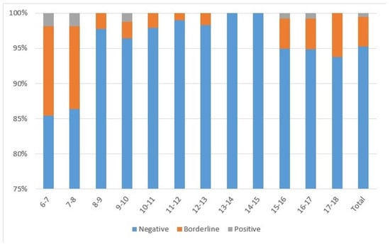 Almost all subjects (n = 1250; 95.1%) had IgG-anti-PT < 40 IU/mL, 4.3% had IgG-anti-PT from 40 to 100 IU/mL (n = 57), and 0.5% had IgG-anti-PT > 100 IU/mL (n = 7) (Figure 1). The highest percentage of subjects with IgG-anti-PT > 40 IU/mL was detected in 6–7-year-olds (n = 18; 16.1%) and 7–8-year-olds (n = 15; 13.8%) following DTaP booster vaccination. All subjects 13–14 and 14–15 years of age had IgG-anti-PT < 40 IU/mL, while a proportion of 15–16 (n = 7; 5.07%), 16–17 (n = 7; 5.19%), and 17–18-year-olds (n = 7; 6.19%) had IgG-anti-PT > 40 IU/mL. Regarding gender, there were 49.9%, 56.1%, and 71.4% males among negative, borderline, and positive subjects, respectively.