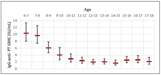 The GMC of IgG-anti-PT for the whole study sample was very low (3.14 IU/mL; 95% CI 2.77–3.53) (Figure 2). The GMC of IgG-anti-PT was the highest in 6–7-year-olds (10.18 IU/mL), followed by 7–8-year-olds (9.82 IU/mL) and 8–9-year-olds (5.87 IU/mL). However, a rapid decline in the GMC of IgG-anti-PT was observed in older age groups, with a negative trend up to 14–15 years of age. When comparing the highest GMC of IgG-anti-PT in 6–7-year-olds with older age groups, we observed a 1.0-fold decrease in 7–8-year-olds; 1.7-fold decrease in 8–9-year-olds; a 2.5-fold decrease in 9–10-year-olds; a 3.5-fold decrease in 10–11-year-olds; a 4.1-fold decrease in 11–12-year-olds; a 5.3-fold decrease in 12–13-year-olds; and a 5.2-fold decrease in 13–14-year-olds. The biggest difference in the GMC of IgG-anti-PT was between 6–7-year-olds (10.18 IU/mL; 95% CI 9.48–10.88) and 14–15-year-olds (1.54 IU/mL; 95% CI 0.06–3.03). That is a 6.6-fold decrease in the GMC of IgG-anti-PT for 8 years. However, a slight increase in the GMC of IgG-anti-PT appears in 15–16-year-olds (2.42 IU/mL), 16–17-year-olds (2.52 IU/mL), and 17–18-year-olds (2.08 IU/mL). When comparing the lowest GMC of IgG-anti-PT observed in 14–15-year-olds, that is a 1.5-, 1.6-, and 1.3-fold increase in age groups of 15–16-, 16–17-, and 17–18-year-olds, respectively. Although coinciding with a rise in the pertussis incidence rate for those age groups, B. pertussis outbreaks were not reported or observed during the study period in Croatia, possibly due to the COVID-19 epidemic. In this study, none of the included subjects reported pertussis-like symptoms within the 12 months of serum sampling or received the Tdap booster vaccine. Therefore, the slight increase in IgG-anti-PT GMC in older age groups could be due to recent unreported or asymptomatic natural infections.