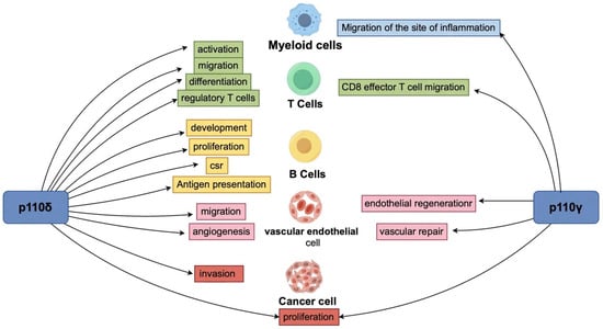 P110δ and P110γ are key subtypes of the PI3K signaling pathway, regulating multiple cellular functions in the tumor microenvironment. P110δ mainly affects the activation and proliferation of T cells and B cells, while P110γ regulates tumor inflammatory responses in myeloid cells. Together, they influence the angiogenesis of vascular endothelial cells and the growth, invasion, and metastasis of tumor cells, playing an important role in the immune regulation of TME and tumor progression.