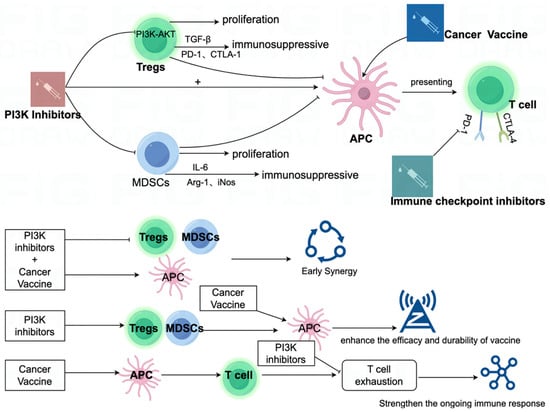 The PI3K signaling pathway profoundly influences immune responses triggered by cancer vaccines by modulating the tumor microenvironment and immune cell activities. Activation of PI3K/Akt signaling in Tregs and MDSCs promotes their proliferation and immunosuppressive functions, facilitated by factors like TGF-β, PD-1, CTLA-1, IL-6, Arg-1, and iNOS, which inhibit APCs and T cell activation. PI3K inhibitors can counteract these effects by inhibiting Tregs and MDSCs, thereby enhancing APC function and promoting T cell activation. When combined with cancer vaccines, PI3K inhibitors foster early synergy, improving antigen presentation and stimulating prolonged immune responses. Moreover, combining PI3K inhibitors with immune checkpoint inhibitors can reduce T cell depletion and boost sustained immune responses, thereby enhancing the efficacy and durability of cancer vaccines.