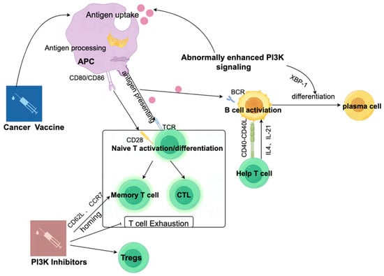 The development of PI3K inhibitors represents a promising strategy to enhance the efficacy of cancer vaccines through the modulation of immune responses. Cancer vaccines enable APCs to process and present antigens, stimulating naïve T cells through interactions with CD80/CD86 and TCRs. This leads to the differentiation of T cells into memory T cells and CTLs while simultaneously activating B cells and driving their maturation into plasma cells through the PI3K pathway. However, excessive PI3K signaling may lead to immune suppression, manifesting as T cell exhaustion and expansion of Tregs. PI3K inhibitors mitigate these effects by reducing Tregs and restoring T cell homing and activation, thereby boosting memory and effector T cell responses. When used alongside cancer vaccines, PI3K inhibitors enhance immune activation, strengthening both cellular and humoral responses to produce a more robust antitumor effect.