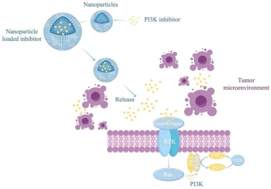 Nanoparticle or liposome encapsulation provides a promising strategy to improve the delivery and effectiveness of PI3K inhibitors and cancer vaccines within the tumor microenvironment. Encapsulation protects the PI3K inhibitors from premature degradation and ensures targeted release at the tumor site, improving drug bioavailability and reducing off-target effects. The nanoparticles are engineered to deliver their payload near tumor cells, enabling the inhibitors to effectively interfere with the PI3K signaling pathway by targeting receptor tyrosine kinases (RTKs) and downstream signaling molecules such as PIP3, thereby inhibiting tumor growth. This approach not only enhances the therapeutic efficacy of PI3K inhibitors but also provides a platform for co-delivery with cancer vaccines, synergistically modulating the immune response and improving antitumor efficacy.
