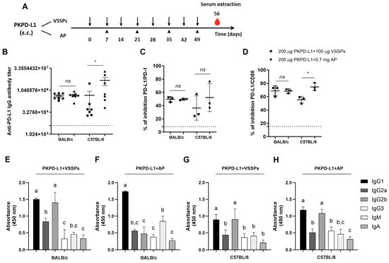 Specific humoral immune response in mice immunized with PKPD-L1. (A) Mice (n = 7) were immunized with the PKPD-L1 antigen in combination with VSSPs or aluminum phosphate (AP) for two months at weekly or two-week intervals, respectively. Control animals received only vehicle–adjuvant preparations and sera were extracted seven days after the last immunization for all groups. The black arrows indicate the immunization days for the weekly scheme and the head arrows the bi-weekly immunization. The blood drop represents the time point for sera extraction. (B) IgG antibody titer against human PD-L1, (C) inhibition of PD-1/PD-L1, and (D) CD-80/PD-L1 interactions by serum from vaccinated mice. (E,F) IgM- and IgA-class antibody response and response of specific IgG subclasses to human PD-L1 in BALB/c mice and (G,H) in C57BL/6 mice. The dashed line represents the average of the titer values or percentage inhibition of the negative control animals. In graph (B), each point represents the individual mice; data are presented as mean and the standard deviation of the mean (SEM). In graphs (C,D), each point represents percentage of inhibition calculated from duplicate samples of pools; data are presented as mean and the standard deviation (SD). p-values were calculated according to the unpaired t-test: ns p ≥ 0.05; * p < 0.05. In graphs (E–H), each column represents the mean absorbance at 450 nm calculated for serum samples from individual mice and the SD. Different letters indicate statistical significance according to one-way ANOVA and a Tukey’s post-test.