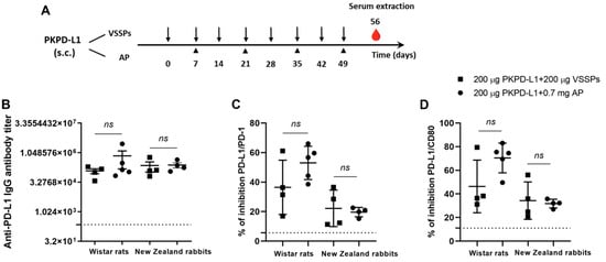Specific humoral immune response in rats and rabbits immunized with PKPD-L1. (A) Rats (n = 5) and rabbits (n = 4) were immunized with the PKPD-L1 antigen in combination with VSSPs or aluminum phosphate (AP) for two months at weekly or two-week intervals, respectively. Control animals received only vehicle–adjuvant preparations and sera were extracted seven days after the last immunization for all groups. The black arrows indicate the immunization days for the weekly scheme and the head arrows the bi-weekly immunization days. The blood drop represents the time point for sera extraction. (B) IgG antibody titer against human PD-L1, (C) inhibition of PD-1/PD-L1 and (D) CD-80/PD-L1 interactions by serum from vaccinated rats and rabbits a week after the last immunization dose. The dashed line represents the average of the titer values or percentage inhibition of the negative control animals. In graph (B), each point represents the individual animals; data are presented as mean and the standard deviation of the mean (SEM). In graphs (C,D), each point represents the percentage of inhibition calculated from duplicate samples; data are presented as mean and the standard deviation (SD). p-values were calculated according to the unpaired t-test, ns p ≥ 0.05.