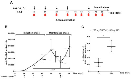 Specific humoral immune response in monkeys after PKPD-L1Vac immunization. (A) Monkeys (n = 3) were immunized with the PKPD-L1 antigen in combination with aluminum phosphate for two months at two-week intervals and re-immunized 29 days later. Arrows indicate immunization days and the drop of blood represents the extraction of the sera before each immunization. (B) IgG antibody titer kinetics against human PD-L1. Each point represents the average titer calculated from duplicate samples of individual monkeys and the standard deviation of the mean titers (SEM). Arrows indicate immunization days. (C) Inhibition of PD-L1/PD-1 interaction by sera from non-human primates. Each point represents percentage of inhibition calculated from duplicate samples; data are presented as mean and the standard deviation (SD). p-values were calculated according to paired t-test, * p < 0.05; ** p < 0.01; *** p < 0.001; **** p < 0.0001.