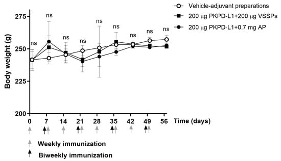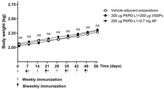 All animals appeared generally healthy during the vaccination period. No changes in overall behavior, feeding, neuromuscular performance, or the appearance of fur in the immunized animals were reported. No significant differences were observed in terms of the body weight of the animals treated with the PKPD-L1 vaccine antigen compared to the vehicle control group plus adjuvants as well as between immunized groups (p > 0.05; two-way ANOVA and Sidak’s post-test (Figure 4).