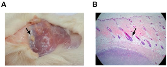 Anatomopathological studies in rats after PKPD-L1Vac immunization. (A) Macroscopic findings related to the injection site in rats (small caseous nodules). (B) Histological analyses of skin injection site lesions from rats treated with 200 μg of PKPD-L1 in combination with aluminum phosphate (black arrow indicates nodular granulomatous formation). The tissues were stained with hematoxylin and eosin (HE) and observed at 10X.