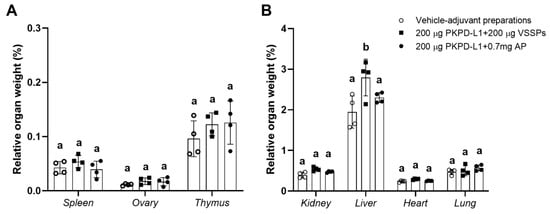 Relative organ weight of selected organs in New Zealand rabbits immunized with PKPD-L1 in combination with VSSPs or aluminum phosphate. Relative weight of small (A) and large (B) organs. Each symbol represents the weight of the selected organs of the individual rabbits (n = 4); data are presented as mean and the standard deviation of the relative organ weight. Different letters indicate statistical significance according to one-way ANOVA and a Tukey’s post-test (p < 0.05).
