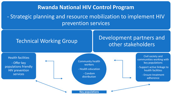 An illustration of the structure and operation of the Rwanda National HIV Control Program.