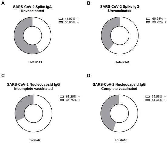 Seropositivity rates for SARS-CoV-2-specific antibodies between unvaccinated and vaccinated cohorts in Ghana. Donut charts represent the seroprevalence of (A) Spike-specific IgA antibodies in the unvaccinated cohort (n = 141), with 56.03% seropositive (grey) and 43.97% seronegative (white); (B) Spike-specific IgG antibodies in the unvaccinated cohort (n = 141), with 39.72% seropositive (grey) and 60.28% seronegative (white); (C) Nucleocapsid protein-specific (NCP) IgG antibodies in the partially vaccinated group (n = 63), with 31.75% seropositive (grey) and 68.25% seronegative (white); (D) Nucleocapsid protein-specific (NCP) IgG antibodies in the fully vaccinated group (n = 18), with 44.44% seropositive (grey) and 55.56% seronegative (white).