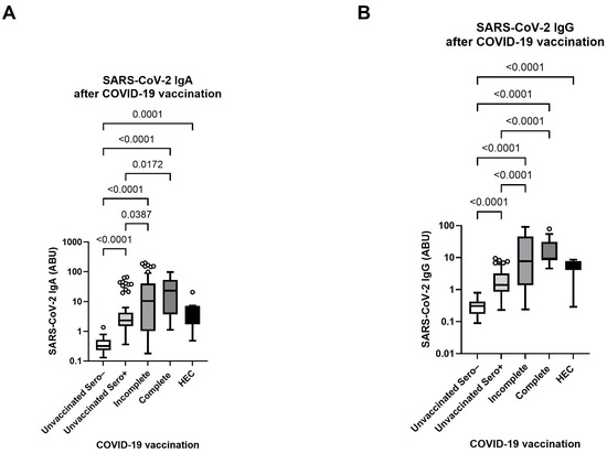 SARS-CoV-2-specific antibody levels in different vaccination and serostatus groups. Box plots represent SARS-CoV-2 spike-specific IgA (A) and IgG (B) antibody expressions in Ghanaian lymphatic filariasis (LF) infected individuals with varying COVID-19 vaccination status compared to completely vaccinated healthy endemic controls (HEC) (n = 10) (black). LF participants were grouped into COVID-19 unvaccinated and SARS-CoV-2 seronegative (n = 37) (white), COVID-19 unvaccinated and SARS-CoV-2 seropositive (n = 87) (light grey), incompletely (n = 63) (medium grey) and completely (n = 18) COVID-19 vaccinated (dark grey). Indicated p values were calculated using Kruskal-Wallis’ test followed by Dunn’s comparison post hoc to compare all groups. Bars represent the median ± IQR of antibody binding units (ABU). Significance is accepted if p < 0.05.
