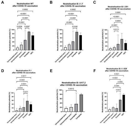 Neutralization potential against different SARS-CoV-2 variants in various vaccination and serostatus groups. Bars represent the expression of SARS-CoV-2 specific neutralizing antibodies in Ghanaian lymphatic filariasis (LF) infected individuals with varying COVID-19 vaccination status compared to completely vaccinated healthy endemic controls (HEC) (n = 10) (black). LF participants were grouped into COVID-19 unvaccinated and SARS-CoV-2 seronegative (white), COVID-19 unvaccinated and SARS-CoV-2 seropositive (light grey), incompletely (1.dose) COVID-19 vaccinated (medium grey) and completely (2.doses) COVID-19 vaccinated (dark grey). The neutralizing potential towards six major SARS-CoV-2 variants, including Wildtype (WT) (A), Alpha (B.1.1.7) (B), Beta (B.1.351) (C), Gamma (P.1) (D), Delta (B.1.617.2) (E) and Omicron (B.1.1.529) (F) was compared. Indicated p values were calculated using Kruskal-Wallis’ test followed by Dunn’s comparison post hoc to compare all groups. Bars represent the median ± IQR of antibody neutralizing potential (%). Significance is accepted if p < 0.05.