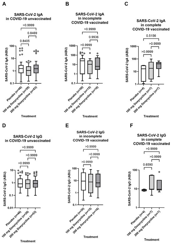Since all participants were part of a clinical trial and received a six-week doxycycline treatment (100 mg/day or 200 mg/day) 36 months before blood sampling, a potential effect of treatment on the SARS-CoV-2 specific antibody response post-COVID-19 infection and/or vaccination was analyzed. However, no statistical differences were observed for the SARS-CoV-2 specific IgA and IgG response among the two doxycycline treatment arms (100 mg/day and 200 mg/day) compared to the placebo control group within unvaccinated, incompletely and completely COVID-19 vaccinated individuals (Figure 6).
