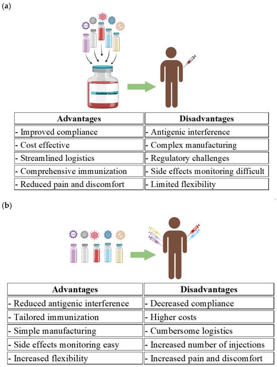 Comparative analysis of combination versus individual vaccines. (a) Advantages and disadvantages of combination vaccines; (b) advantages and disadvantages of individual vaccines. Created with BioRender, available from https://www.biorender.com/ (Accessed on 20 January 2025).