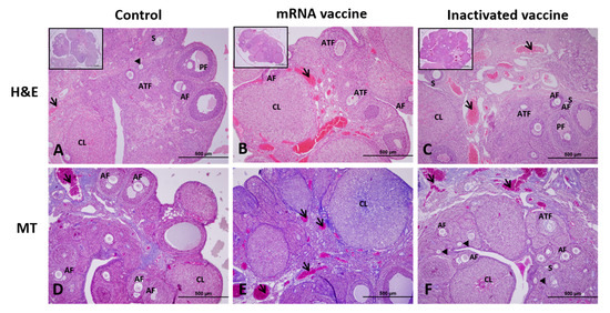 Ovarian images of the control, mRNA vaccine, and inactivated vaccine groups after Hematoxylin and Eosin (H&E; A–C), and Masson’s Trichrome stainings (MT; D–F). CL; corpus luteum, ATF; atretic follicle, S; secondary follicle, AF; antral follicle, PF: preovulatory follicles, Arrow; blood vessel, Arrowhead; primary follicle. Scale bars: 500 µm.