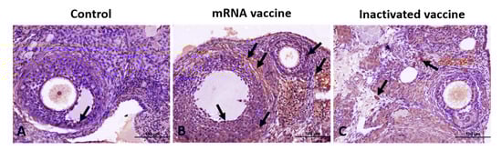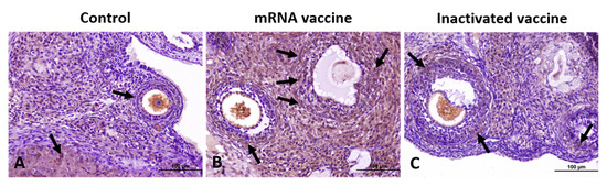 Immunohistochemical staining of AMH in ovarian sections from the control (A), mRNA vaccine (B), and inactivated vaccine (C) groups. Arrows: immunopositive cells. Scale bars: 100 µm.