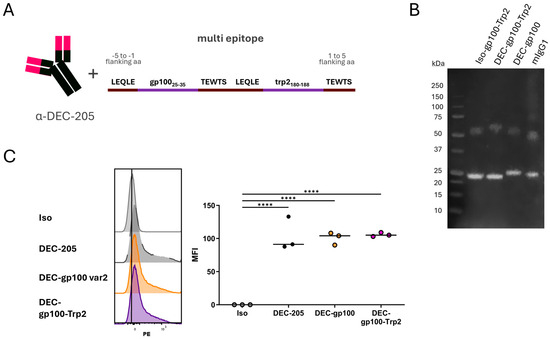 As previously described by us and others, DEC-205-antigen fusion constructs deliver antigens successfully to DC and induce antigen-specific T cell responses [18,30]. Hence, the melanoma antigen peptide sequence for either gp10025–33 or trp2180–188 was genetically fused to the N-terminus of the heavy chain of the anti-DEC-205 (clone NLDC-145) antibody, similarly to previously published work [16]. The human gp100 sequence (KLPRNQDWL) was selected due to its increased immunogenicity compared to the mouse gp100 sequence [31]. The five amino acid long flanking sequences derived from the respective melanoma antigens themselves (var1), or the flanking sequences of the OVA257–264 SIINFEKL peptide (var2), were used to ensure antigen processing (Figure 1A). As a negative control, the coding sequence of antigenic peptides were cloned into an anti-TNP isotype control antibody (clone: 7B4). The Western blot analysis of FPLC-purified antibody–antigen constructs confirmed the production of both heavy and light antibody chains, with a size of 50 kDa and 25 kDa, respectively (Figure 1B, Supplementary Figure S1A).