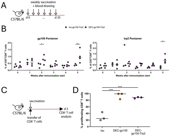 In vivo testing of the multi-epitope DEC-gp100-Trp2 DC vaccine. (A,B) C57BL/6 mice received subcutaneous vaccinations into the flank skin with 5 μg of the DEC-gp100-Trp2 multi-epitope DC vaccine or multi-epitope isotype control in the presence of pI:C/aCD40 (12.5 μg each) adjuvant mix. Blood samples from the mice were collected weekly on the same day as vaccination and blood samples were analyzed via flow cytometry for the presence of antigen-specific T cells. (A) Experimental design. (B) Results showing the expansion of endogenous antigen-specific CD8+ T cells for each of the pentamers tested. One experiment is shown, two-way ANOVA with Tukey’s multiple comparisons test. n = 3–4 mice. (C,D) C57BL/6 mice received 1 × 106 CFSE-labelled, purified gp100-specific CD8+ T cells intravenously prior to subcutaneous vaccination with 0.5 µg DEC-gp100, 0.5 μg DEC-gp100-Trp2, or 0.5 µg Iso-gp100. All treatment groups received the adjuvant mix of pI:C/aCD40 (12.5 μg each). T cell proliferation was determined by flow cytometry analysis of the vaccination-site-draining lymph node on day 3 post-vaccination. (C) Experimental design. (D) Results showing gp100-specific T cell proliferation, one-way ANOVA with Tukey’s multiple comparisons test. n = 3 (*, p < 0.05; **, p < 0.01; ***, p < 0.001).