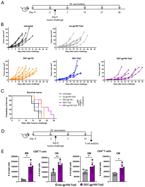 After we confirmed the induction of CD8+ T cell responses after vaccination with the multi-epitope DEC-205 antibody, we tested this vaccine in a prophylactic melanoma therapy approach. C57BL/6 mice were immunized either with the DEC-gp100-Trp2 or with one of the single-epitope DC vaccines, DEC-gp100 or DEC-Trp2. The DC vaccines including the isotype control containing both epitopes (Iso-gp100-Trp2) were injected in the presence of pI:C/αCD40. At the same time, unvaccinated control mice were injected with saline (PBS). Two days after the second immunization, we transplanted B16.OVA cells into the opposite flank from the vaccination site. Vaccinations were continued weekly until the experimental endpoint (experimental design, Figure 5A). Tumor growth measurements showed that the DEC-gp100-Trp2 vaccine could delay tumor outgrowth compared to multi-epitope isotype- or single-epitope-vaccine-immunized mice (Figure 5B). The survival of vaccinated mice was significantly improved by DEC-gp100-Trp2 immunization compared to the other treatment groups or the control group (Figure 5C) [32]. To confirm that the inhibition of tumor growth was due to the expansion of melanoma antigen-specific CD8+T cells after vaccination with the multi-epitope DC vaccines, C57BL/6 mice were immunized with the multi-epitope DC vaccine, DEC-gp100-Trp2, or with one of the single-epitope DC vaccines, DEC-gp100 or DEC-Trp2. Control treatment groups received Iso-gp100-Trp2, DEC-OVA, or were left untreated. All treatment groups received pI:C/αCD40, except for the untreated, which received PBS. On day 9 post-immunization, the mice were challenged with B16.OVA cells (experimental design, Figure 5A). Immunizations were repeated weekly, blood samples were collected on the same day, and antigen-specific T cells were detected using gp10025–33 and trp180–188 specific pentamer staining. As shown in Supplementary Figure S5, immunization using single-epitope DC vaccines induced the expansion of CD8+ T cells specific for the corresponding epitope. The expansion of both gp100- and trp2-specific CD8+ T cells was induced after immunization with the multi-epitope DC vaccine DEC-gp100-Trp2. Moreover, immunization with the DEC-OVA DC vaccine was unable to induce gp100- or trp2-specific CD8+ T cells (Supplementary Figure S5). These data indicate that the expansion of antigen-specific CD8+ T cells in the periphery is restricted to the epitope contained in the DC vaccine.