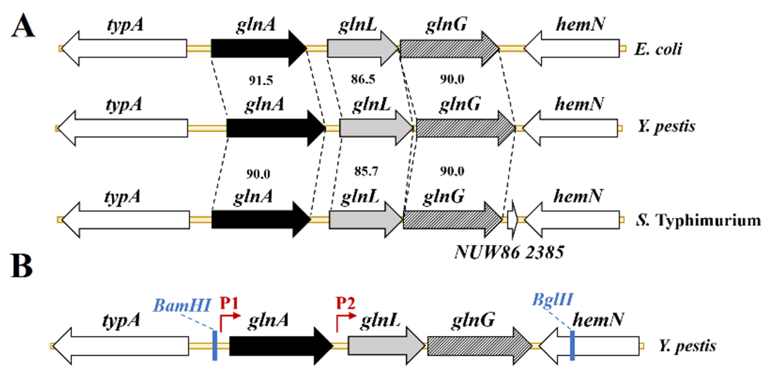 - Nohno, T.; Saito, T.; Hong, J. Cloning and Complete Nucleotide Sequence of the Escherichia coli Glutamine Permease Operon (glnHPQ). Molec. Gen. Genet. 1986, 205, 260–269. [Google Scholar] [CrossRef] [PubMed]